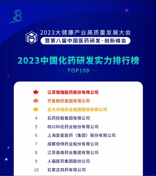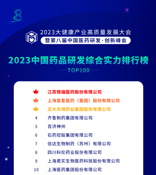 由药智网、中国药业杂志社主办的2023大健康产业高质量发展大会暨第八届中国医药研发•创新峰会于6月16日开幕,会上发布了《2023中国药品研发实力排行榜》系列榜单,ag真人国际官网医药凭借深厚的创新研发实力再创辉煌:荣登《2023中国药品研发综合实力排行榜TOP100》榜首、《2023中国化药研发实力排行榜TOP100》榜首。值得一提的是,今年是ag真人国际官网医药连续第6年入选《中国药品研发综合实力排行榜》榜首。