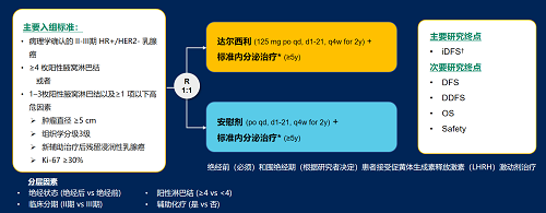 达尔西利(Dalpiciclib)是ag真人国际官网医药自主研发的口服、选择性的小分子CDK4/6抑制剂,也是中国首个自主研发的新型高选择性 CDK4/6 抑制剂,已证实其与内分泌治疗(ET)联合用于 HR+/HER2- 晚期乳腺癌的一线和后线治疗时,均显著改善无进展生存期(PFS)6,7。因此开展了一项随机、双盲、III期临床试验(DAWNA-A),以进一步评估达尔西利联合内分泌治疗作为高危早期 HR+/HER2 - 乳腺癌辅助治疗的效果。本研究纳入高危复发风险人群需满足以下标准之一:①≥4 枚阳性腋窝淋巴结;②1–3枚阳性腋窝淋巴结且合并≥1 项高危因素(肿瘤直径 ≥5 cm,组织学分级3级,辅助治疗后残留浸润性乳腺癌,Ki-67 ≥30%)。本文呈现预先设定的首次中期分析(IA1)结果。