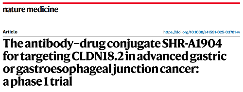 ag真人国际官网医药CLDN18.2 ADC创新药SHR-A1904治疗胃癌临床研究结果荣登Nature Medicine